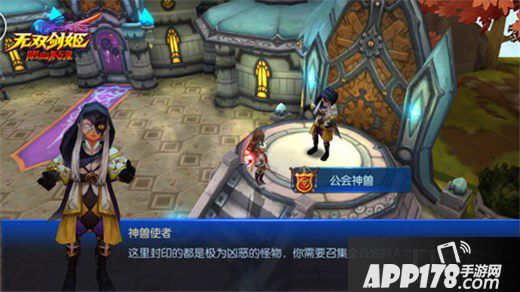 神兽使者的功能是为公会召唤神兽,利用公会红钻石每周可召唤两次,普通神兽、噩梦神兽和深渊神兽分别对应着三种花费和收益,全公会玩家均可参与讨伐,战胜后,大量的星魂和贡献值即可轻松入手。
