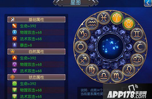 星图注明了当前星点的位置、点亮后增加的属性、所要消耗的星魂数和角色需要达到的等级。一开始星图是黯淡无光的,当满足了所有条件后,点击“点亮”按钮即可点亮星点,获得效果,提升战力。