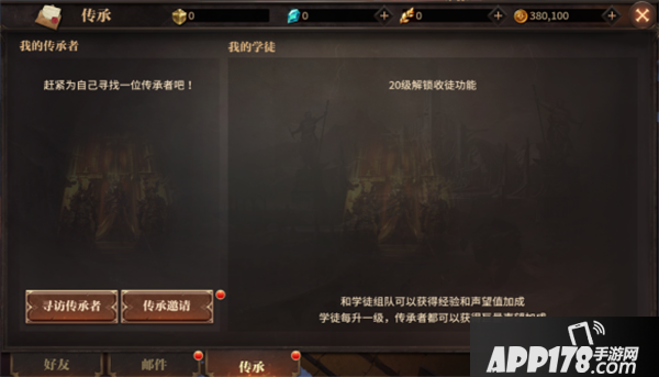 在“社交”模块中可以找到传承的入口。如果想要寻找一位传承者,点击对应按钮,并选择心仪的传承者,在交纳一定费用之后,便可以申请成功。您可以同时申请多个传承者,只会扣除一次传承费用。最后谁将成为您的传承者,依据您发出的传承申请最先得到同意的玩家而定。当然也会有传承者邀请您成为他/她的学徒,此时您只要决定是否同意即可。