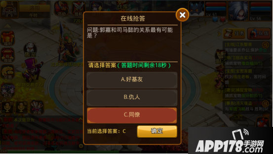 在线抢答开启时间为每天的10:00-23:00,每隔15五分钟将会在系统频道出现问题同时会在主界面上出现一个抢答的按钮,需要玩家回答按钮里的问题,回答问题提交之后会在世界频道中显示您所回答的内容,当成功之后将会获得奖励。