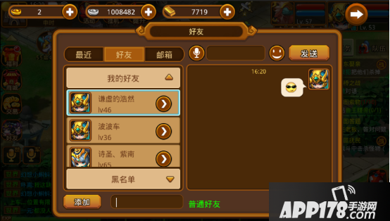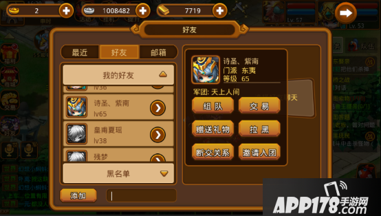点击主界面的俩美女打开好友列表。你可以在好友列表界面进行添加、删除好友,发消息、拉黑和查看好友、给予等操作。