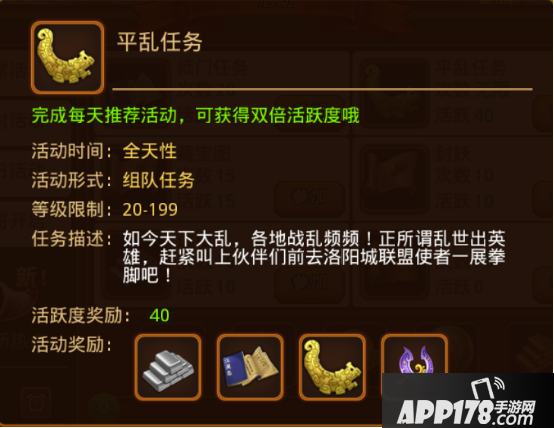 20级就开放的平乱任务,让你经验、银两双丰收,可谓是赚钱、升级的最佳选择,没有之一。