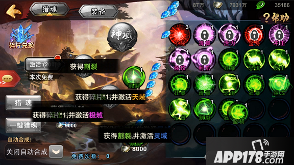 “天域激活”可以通过消耗魂玉快速进行一次“天域”猎魂,不仅有较高概率获得高品质魂,还会额外获得大量魂碎片和一枚可以提供300点经验的经验魂。通过天域激活可以快速获得高品质魂、经验以及可用来兑换完整魂的碎片。