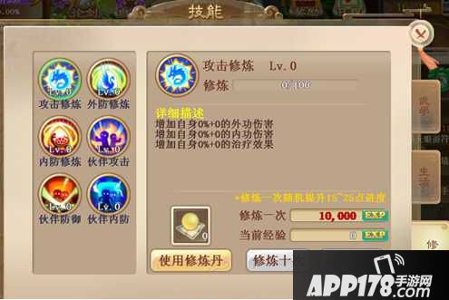 修炼技能可以通过消耗经验值,提升自身和伙伴的伤害和防御