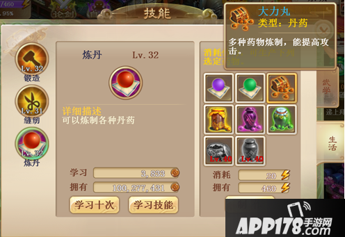生活技能主要是消耗体力,制作装备符和丹药