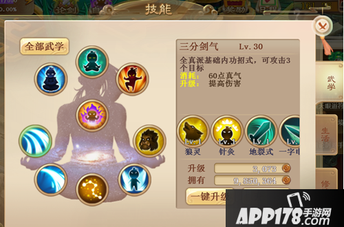 武学技能由3个固定的心法、内功、身法,五个武学招式,和一个自创技能组成