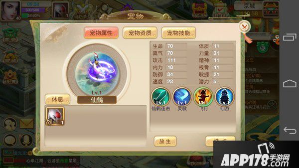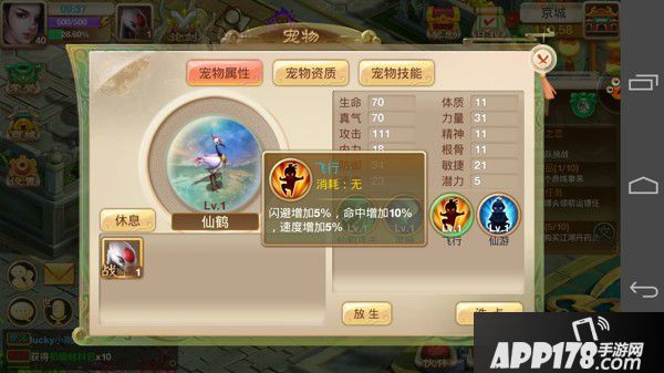 新手进入游戏后,即会自动获得一只【仙鹤】宠物,属性都较为平均,是比较偏外功输出的类型~