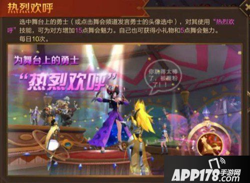 注:对别人进行欢呼将会每次获得5点舞会魅力,别人对自己欢呼将会获得15点舞会魅力。拥有舞会魅力可以参与到舞会魅力排行榜,每周结算一次排行榜奖励~
