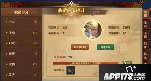 通过各部分收藏内容的评分叠加,达到升级所需总评分即可点击升级,同时获得一定的等级奖励。