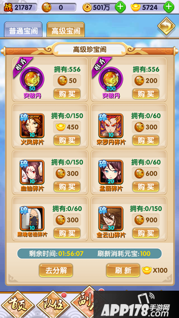 商店内主要出售各类碎片,进化,升级道具, 使用钻石和红色宝石购买。(红色宝石可通过转化多余的角色,装备等等获得)