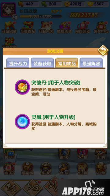 常用物品:突破丹(用于人物突破),灵晶(用于人物升级)