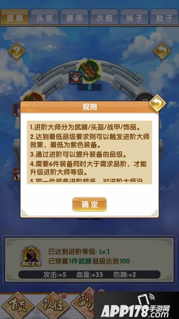 进阶大师可以进阶武器,头盔,战甲和饰品,通过进阶可以提升装备的品质,不过最低为紫色装备。