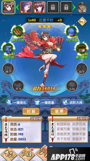 人物可以装备八个装备,点击相应位置可以选择装备穿戴和强化,也可以点击一键装备和一键强化简化操作,统统一键搞定。