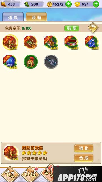 可以查看道具,选择强化或者合成。可以通过花费元宝来扩充背包空间。