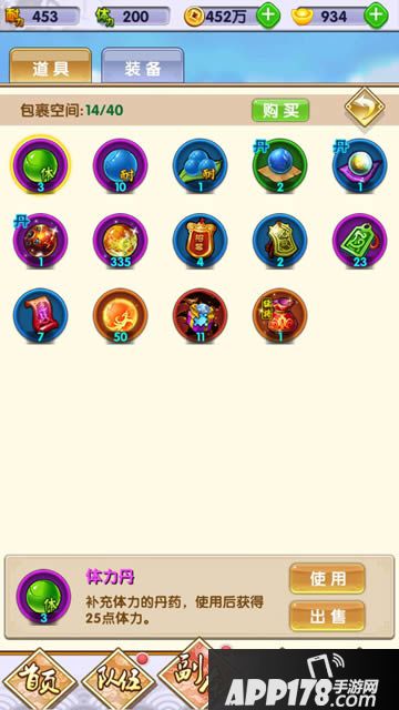 可以查看道具,选择使用或者出售。可以通过花费元宝来扩充背包空间。