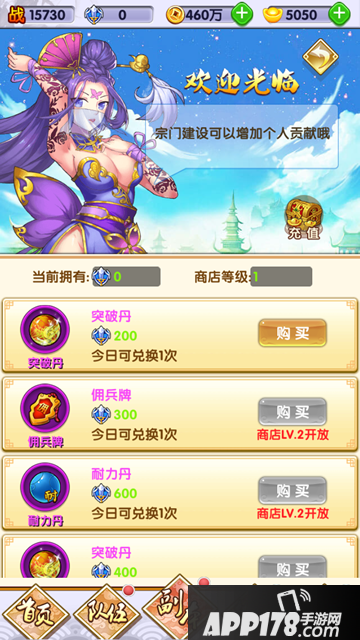 在《我欲封天之至尊归来》宗门商店中,玩家可以通过消耗贡献值来购买突破丹,体力丹等道具。贡献值则可以通过建设宗门来获取。