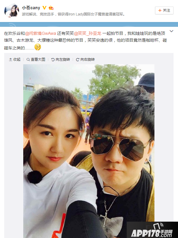 就在小编紧密追踪娃娃信息的同时,突然发现电竞女神小苍也在微博上发了一张与娃娃在一起的图片,这两人在一起了?不过看过文字之后,才发现小苍不仅@了娃娃,还@了笑笑,原来并不是两人独处啊,而是三人在拍节目。这才是三人齐聚上海欢乐谷的最终原因吧,不过小编很好奇这个节目是什么关于什么的,弄得如此之神秘。
