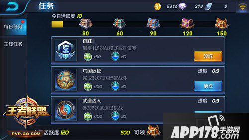 初入《王者联盟》,可以看到游戏的主界面右上方有金币和钻石栏,金币和钻石是玩家购买符文、购买英雄的主要货币。而想要快速获取钻石和金币,除了正常的完成对战模式、冒险模式获得的奖励外,任务是玩家获取金币的必选途径。玩家通过不断达成任务的要求,获取海量的金币和钻石,让玩家可以购买更多英雄和符文,让自己团队更具威力。