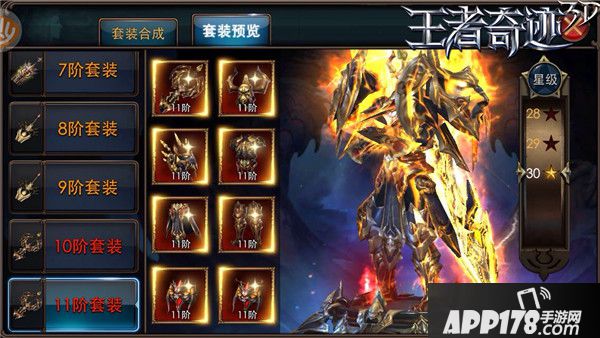 在此特别展示角色狂战士的高阶装备。身着11阶套装,被闪闪发量的盔甲所覆盖,不停地挥舞着金光耀眼的利器也丝毫不费力气,背景特效传出咔咔的打击声。赶快收集碎片,登陆合成系统合成装备吧!