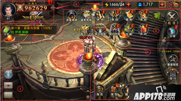 ★玩法区域显示战役、活动,奖励,冒险,日常。竞技、休闲、装备商城、道具商城、每日一礼、明日领取、每日充值、宝藏。点击相关按钮后,就可以进行相关的玩法。