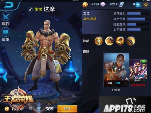 达摩相比其他战士型英雄来看,是更依赖技能的输出的,而本身也有不错的辅助手段、强开团的能力以及在后期的伤害输出。半肉半输出的达摩不能在短时间内击杀目标,需要在队友的配合下,才能展示自己的强大能力。