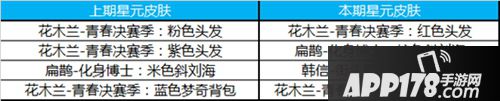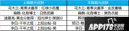 干将莫邪-冰霜恋舞曲,孙悟空-大圣娶亲、露娜-一生所爱、花木兰-瑞麟志、苏烈-玄武志、百里玄策-白虎志、百里守约-朱雀志、铠-青龙志。