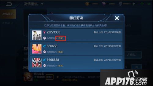 我们默认打开了友情重燃功能的开关,玩家们可以在更新后邀请列表中看到回归老友的标识,并且为了便于大家查找回归老友,我们新增了入口显示近期回归的老朋友