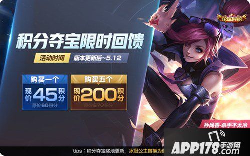 积分夺宝奖池更新:嬴政、哪吒替换为司马懿、成吉思汗。鹊桥之恋回城特效(永久)替换为猪事顺利回城特效(永久)。冰冠公主(永久)替换为偶像歌手(永久)