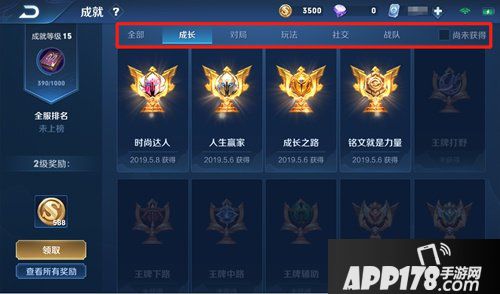 为了便于大家从日益增多的成就中更方便地查看信息,成就新增分类,分为成长、对局、玩法、社交、战队五个类型,玩家可以点击各个页签找到相关类型的成就。