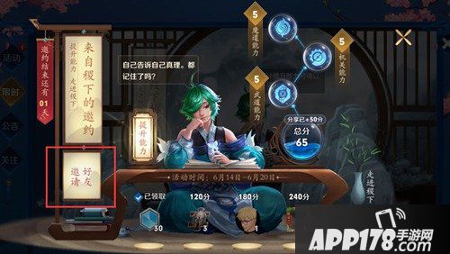 3.提升能力(分数):每日完成登录、对局、完成学科特殊任务可分别魔道、武道、机关三科分数(详见提升能力面板),活动期间分享稷下的邀约(图片)可额外+50分,规则如下表: