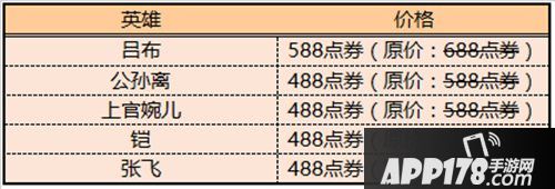 (公孙离、吕布、上官婉儿、铠、张飞、公孙离-花间舞、吕布-末日机甲、上官婉儿-修竹墨客、铠-龙域领主、张飞-五福同心)