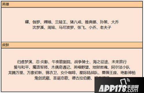 成吉思汗-维京掠夺者、裴擒虎-街头旋风、典韦-黄金武士、张飞-五福同心、甄姬-花好人间、刘邦-圣殿之光
