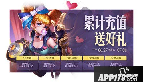 庆稷下星之队版本更新,第一波充值福利来袭——累计充值送好礼。累计充值988点券可额外获得总价值610点券的奖励(包括皮肤碎片*13+积分夺宝抵用券*3+铭文碎片*300)。