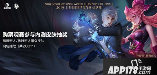 2019年世冠总决赛现场,除了能够亲临现场见证世冠冠军加冕之外,到场的召唤师们也将有机会获得诸多好礼。200个珍贵的内测皮肤——孙尚香“蔷薇恋人”、嬴政“优雅恋人”将从购票并前往现场观赛的观众中随机抽奖发放,期待召唤师们的到场!