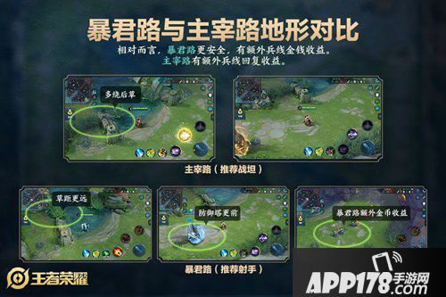 设计目的:为优化边路体验,原有的上下路,分别改为暴君路和主宰路,暴君路推荐使用射手英雄,主宰路推荐使用战坦英雄。
