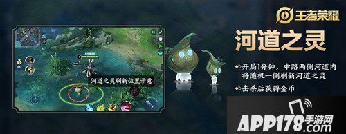 开局1分钟,中路两侧河道内将随机一侧刷新河道之灵(临时名),击杀后可获得金币。