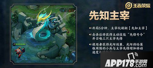开局5分钟,主宰坑刷新先知主宰(临时名),击杀后将获得主动技能先锋号角,使用后将从基地召唤3只主宰先锋,从己方基地出发朝对方水晶推进。同时,使用者获得光环效果——光环将给英雄周围的小兵与主宰先锋增加移动速度与防御力。