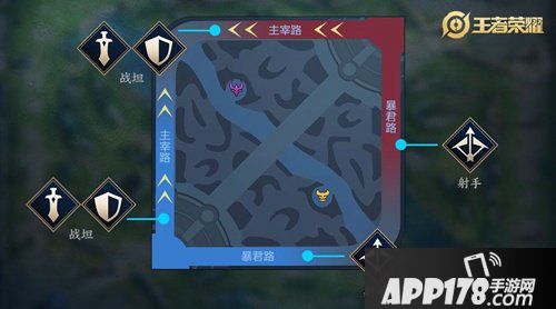 处于蓝方时,原上、下路分别改为主宰路(推荐战坦)、暴君路(推荐射手)。处于红方时,原上、下路为暴君路(推荐射手)、主宰路(推荐战坦)。