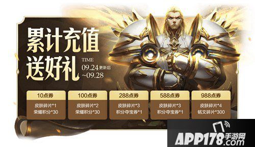 累计充值988点券可额外获得总价值610点券的奖励(包括皮肤碎片*13+积分夺宝抵用券*2+荣耀积分*60+铭文碎片*300)。