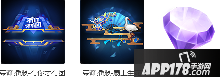 打开后可任意选择以下奖励之一:有你才有团-荣耀播报(永久)、扇上生花-荣耀播报(永久)、钻石*70。