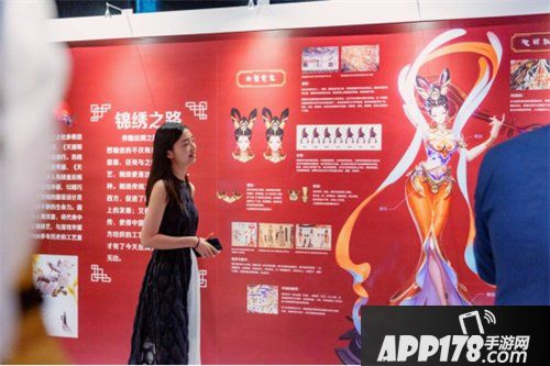 本次展览现场为观众呈现了王者荣耀与敦煌研究院合作完成的杨玉环“飞天”皮肤,带领观众感受隋唐时期的飞天形象与瑰丽的敦煌之美。这款皮肤的设计过程历时半年,它的设计背后包含了多达9处敦煌文化内容参考,从皮肤的发型、首饰、服饰,到披肩、色彩以及乐器,都取材自敦煌的壁画。