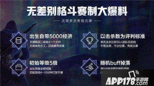 KPL周年庆“无差别格斗赛”将采取全新玩法——“秀”就完事了,让你享受一场视觉盛宴!届时各职业选手和主播将不论自己的位置,选择自己喜欢的最“秀”英雄,“出生”即5级并自带5K经济,让英雄无需发育,直接开“斗”!同时周年庆比赛每4分钟都会有随机的Buff掉落,各位召唤师可以通过助威的方式给予你所支持的选手送上游戏内Buff。最终的以击杀数为胜负评判标准,率先击杀30人的队伍获胜,无需运营,不分位置,只要“秀”得飞起,他就会是最后的胜者。