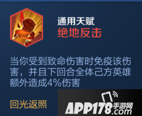 绝地反击是通用型S级天赋,能够免疫一次致命伤害,并且获得4%的额外伤害。看上去效果不错,能够保证让玩家多活一次,可是往往很少出现这种非常焦灼的局面,到最后都是直接碾压的局势,不是碾压别人就是被人碾压,因此这个天赋实际用处并不是很大。
