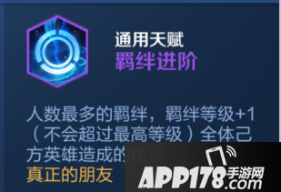 羁绊进阶是通用A级天赋,这个天赋可以让人数最多的天赋增加一个等级,比如原来是五刺客,现在直接可以激活七刺客的BUFF效果。这个天赋可以让玩家在人数较少的时候打成天赋效果,同时把剩下的位置给其他英雄使用,从而触发更多的羁绊效果。