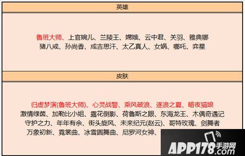 【限免皮肤】:虞姬-云霓雀翎、梦奇-胖达荣荣、干将莫邪-久胜战神、孙悟空-地狱火、孙尚香-末日机甲、达摩-黄金狮子座、后羿-黄金射手座、张良-黄金白羊座、宫本武藏-地狱之眼、貂蝉-仲夏夜之梦、武则天-海洋之心、花木兰-冠军飞将、狄仁杰-超时空战士。