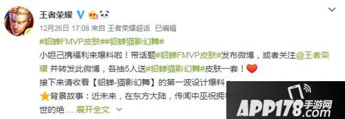 近日《王者荣耀》官微宣布了貂蝉FMVP皮肤猫影幻舞。官方将在带话题#貂蝉FMVP皮肤#发布微博或是关注@王者荣耀并转发该微博的网友中抽取5名,赠送“貂蝉猫影幻舞”皮肤一套。