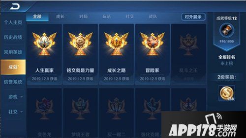 为了让玩家能够更好地对外展示自己的成就,我们将成就系统的入口移入个人资料页面,玩家从已获得的成就中任选最多4个对外展示。访问其他玩家个人资料页面时,即可看到该玩家对外展示的成就。