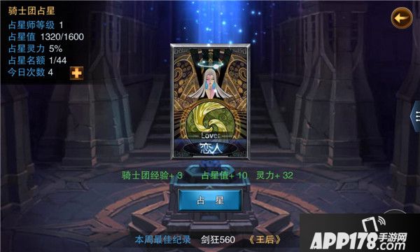 骑士团玩法,每天有5次免费占星次数,占星会从8种占卜塔罗牌卡片中,随机选中一项,占星结果的等级越高,获得的奖励越丰厚。