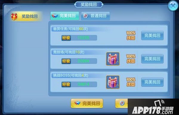 在找回界面中,给玩家提供了两种找回方式,一种是“完美找回”,一种是“普通找回”,完美找回可以找回100%的奖励,普通找回只可以找回60%的奖励;