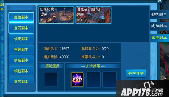 这里有经验副本、宝石副本、仙宠副本、橙装副本、时装副本、铜钱副本、真气副本。拉上自己的小伙伴去探宝吧!